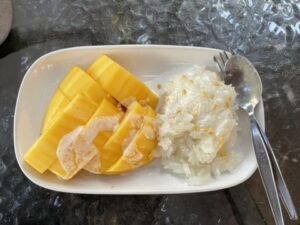 お昼には、ここの名物料理、「マンゴー・ライス」を食しました(値段は50バーツ、約250円)。マンゴーと餅米をココナッツで蒸した餅米飯を添えただけのものです。何とも言えぬ風味があり、私は病みつきとなり、お昼の定番となりました。