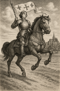 「オルレアンの乙女」は、男性中心の戦場で純潔と信仰を貫いた若き指導者としての敬称です。馬上で旗を掲げる姿はフランス独立の象徴となり、各地に騎馬像が残ります。